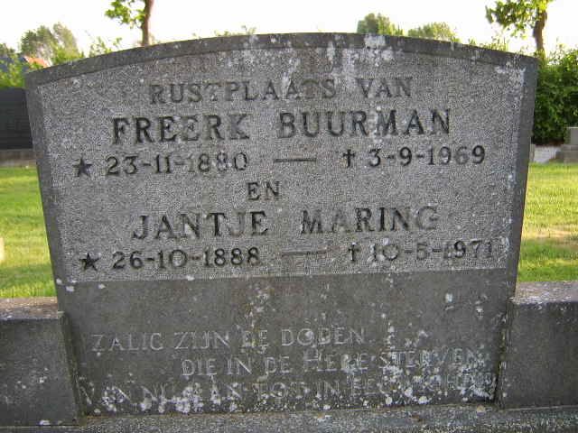 III-B Jantje Cornelis Maring, dochter van Cornelis Harms (II-A) en Bauke Jans, landbouwer, is geboren te Uithuizermeeden (Hefshuizen), is gedoopt op zondag 16 april 1769 aldaar, is overleden op vrijdag 8 juni 1855 te Uithuizen (Hefshuizen). Jantje werd 86 jaar, 1 maand en 23 dagen.